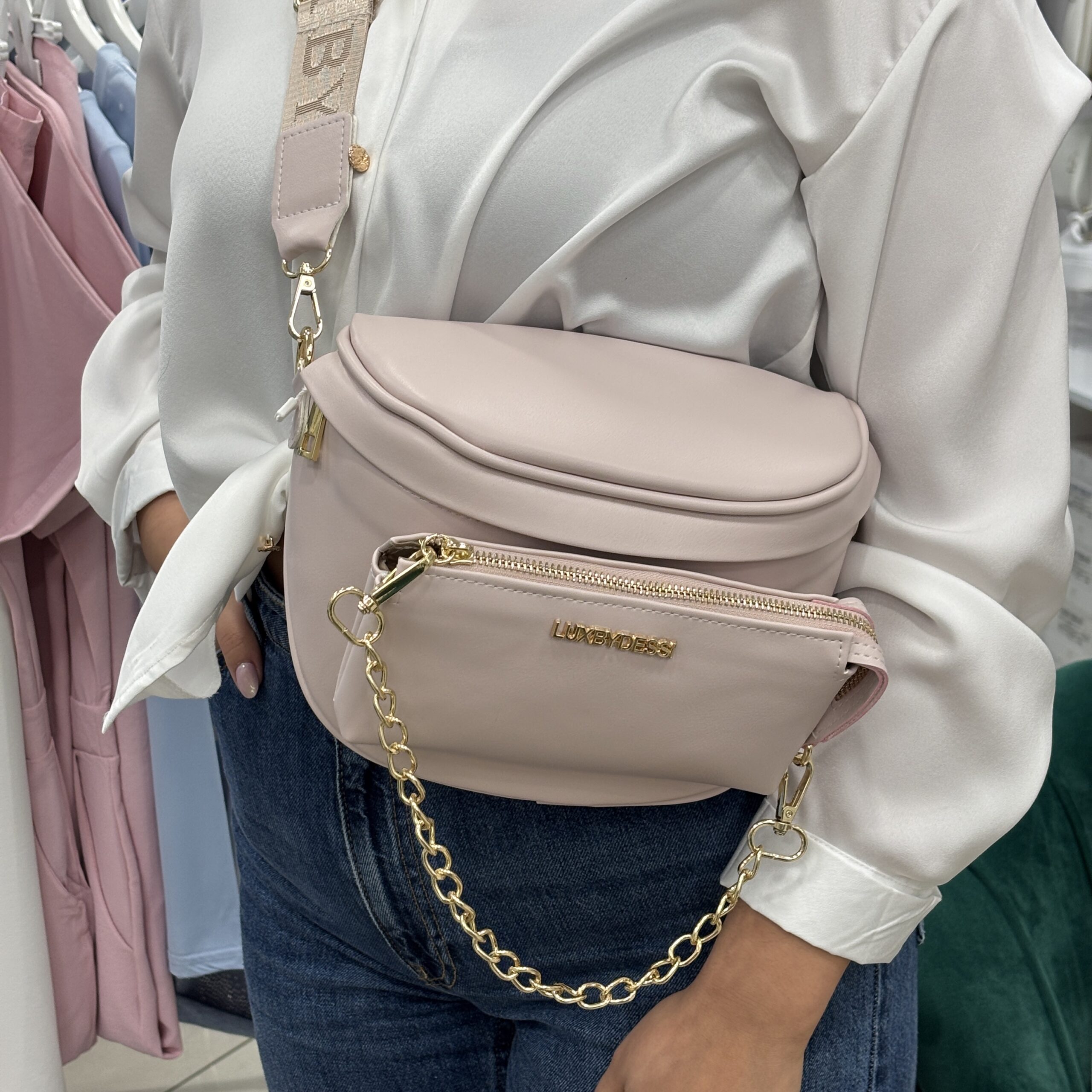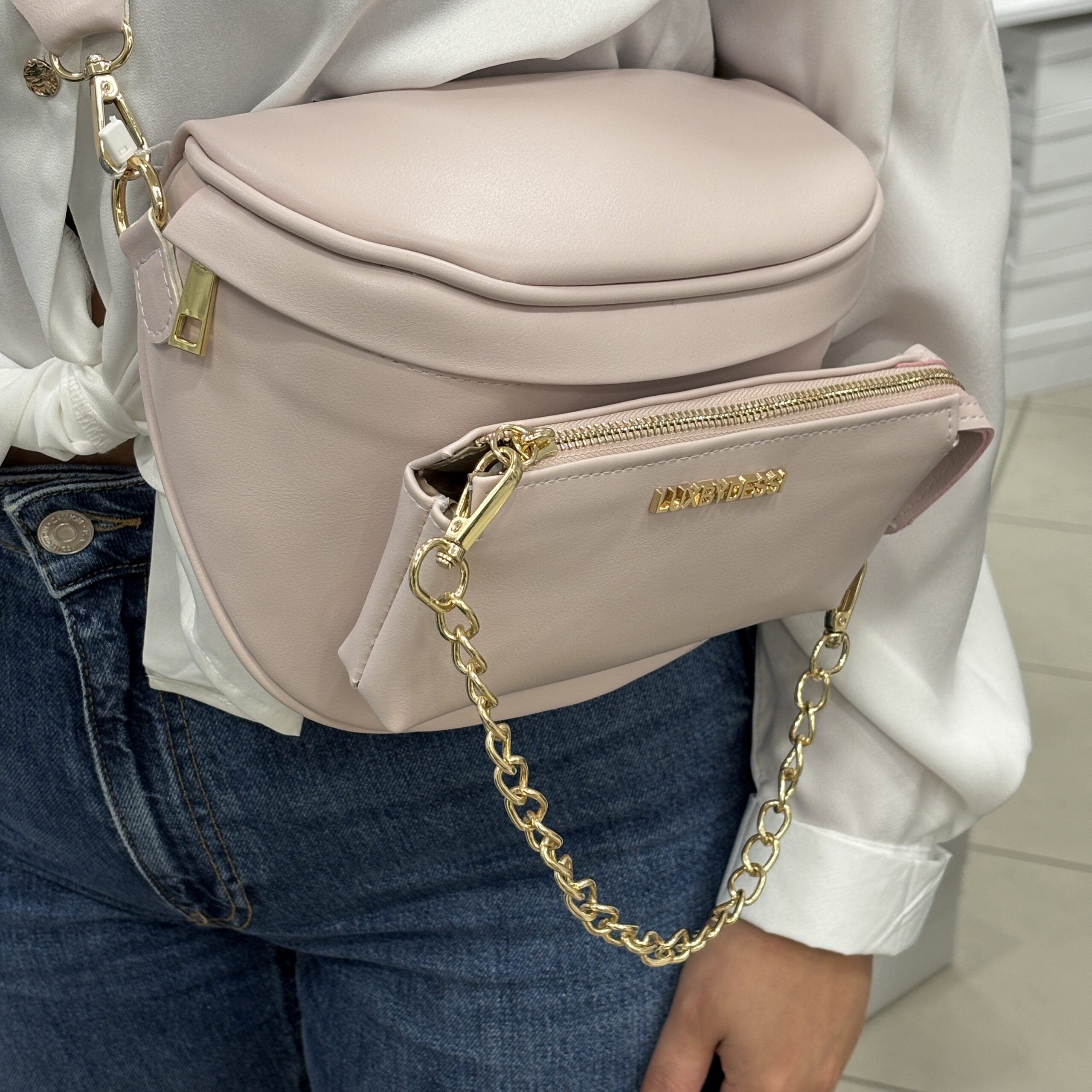 A prémium hatású, enyhén texturált műbőr felület kifinomult megjelenést biztosít, míg az aranyszínű cipzárak és láncos díszítés nőies, divatos karaktert adnak a táskának. A széles, állítható pánt kényelmes viseletet garantál, akár vállon, akár keresztben hordod.