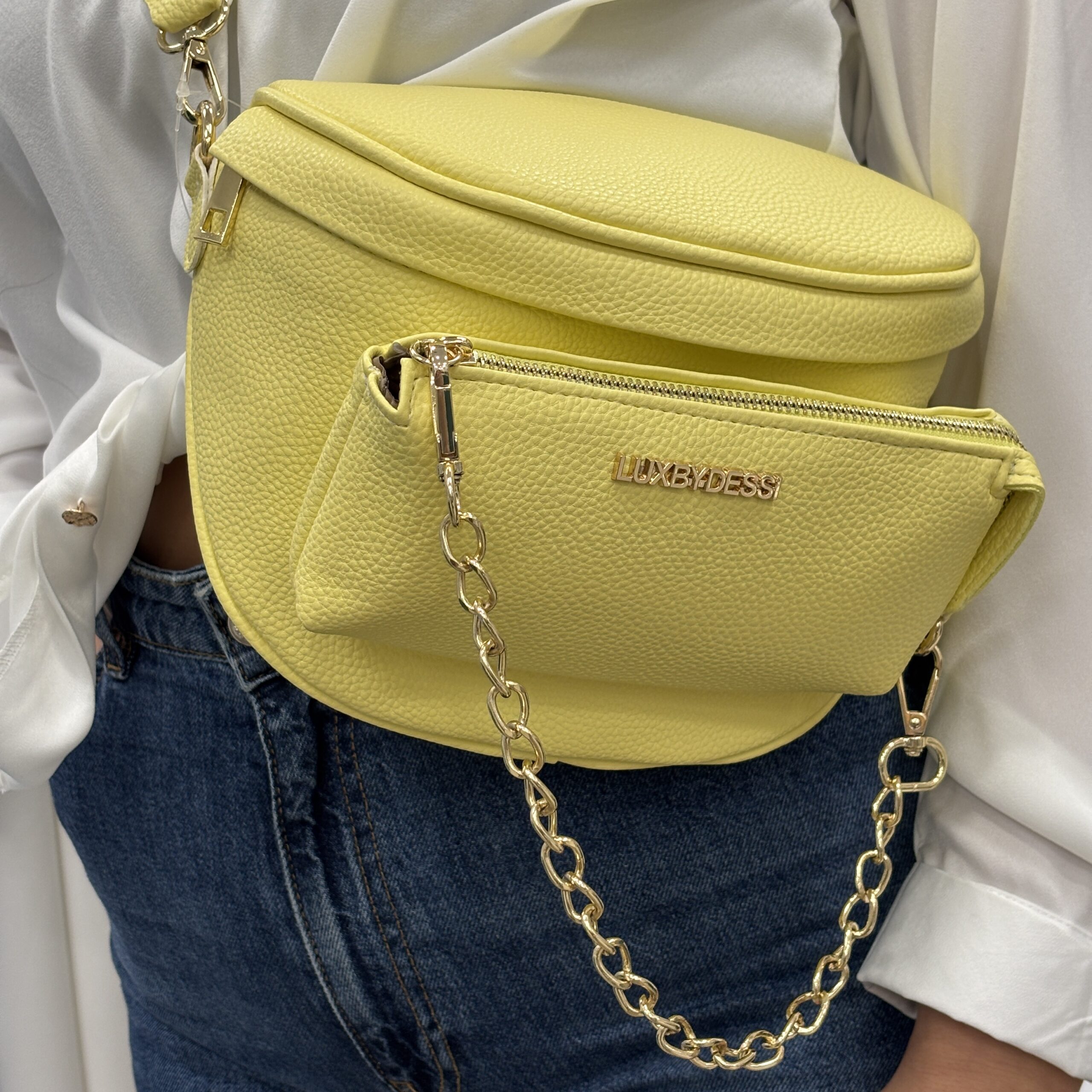 A prémium hatású, enyhén texturált műbőr felület kifinomult megjelenést biztosít, míg az aranyszínű cipzárak és láncos díszítés nőies, divatos karaktert adnak a táskának. A széles, állítható pánt kényelmes viseletet garantál, akár vállon, akár keresztben hordod.