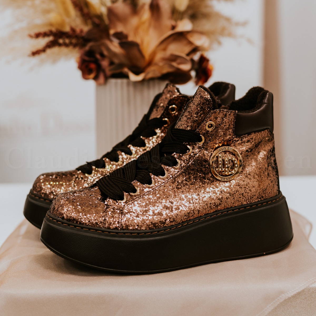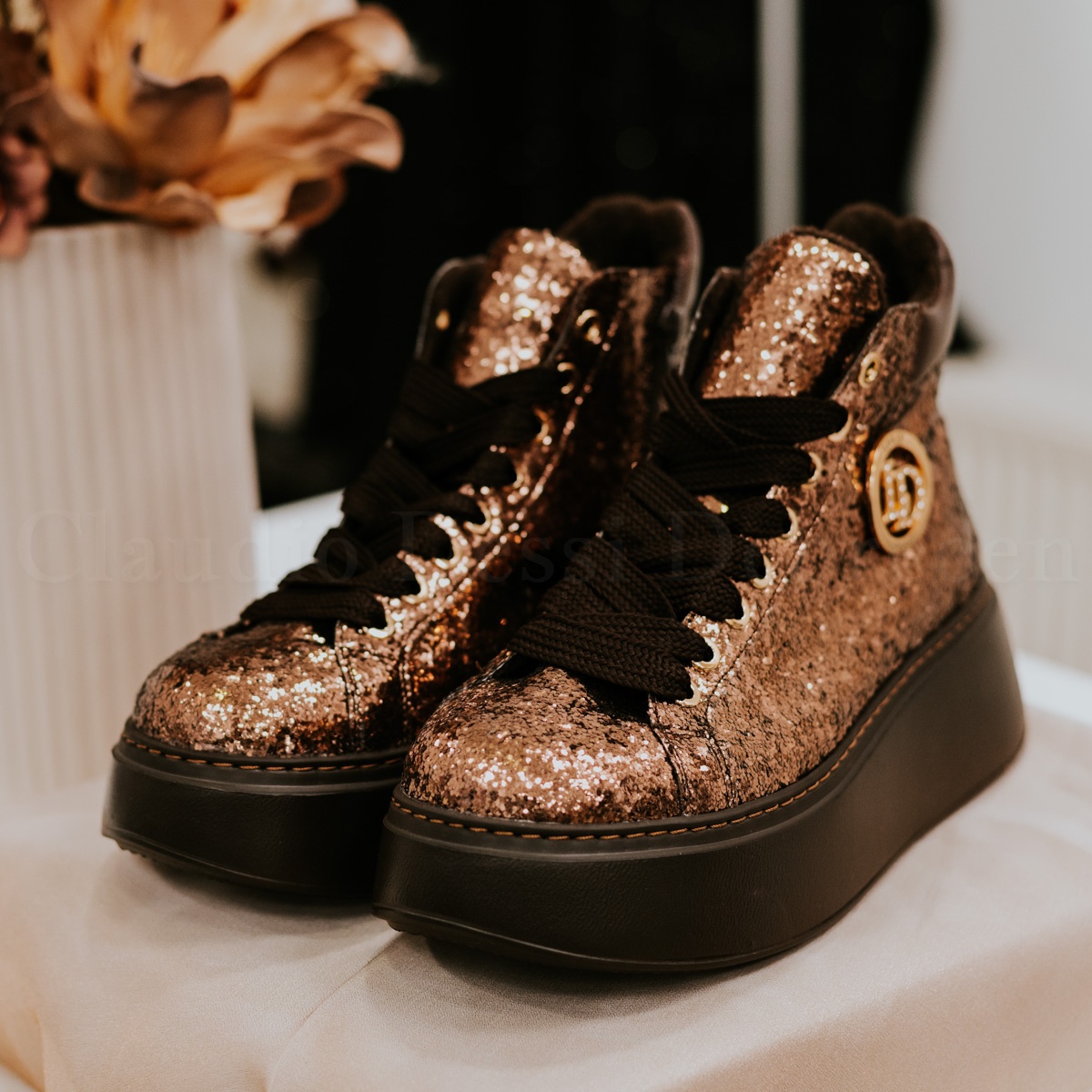 A fényes, barna glitter bevonat és a prémium kidolgozás a márkára jellemző eleganciát sugározza, miközben a kényelmes talpkialakítás gondoskodik a mindennapi viselhetőségről.