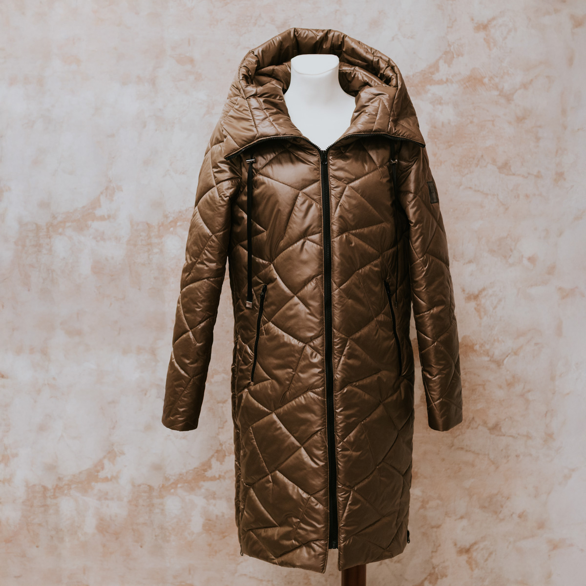 A nagyméretű, formázott kapucni extra védelmet ad a hideg széltől, miközben karakteres, luxus hatású megjelenést kölcsönöz. A hosszanti szabásvonalak és a rombuszsteppelt minta optikailag nyújtják az alakot, így minden mozdulatod könnyed és harmonikus lesz.
