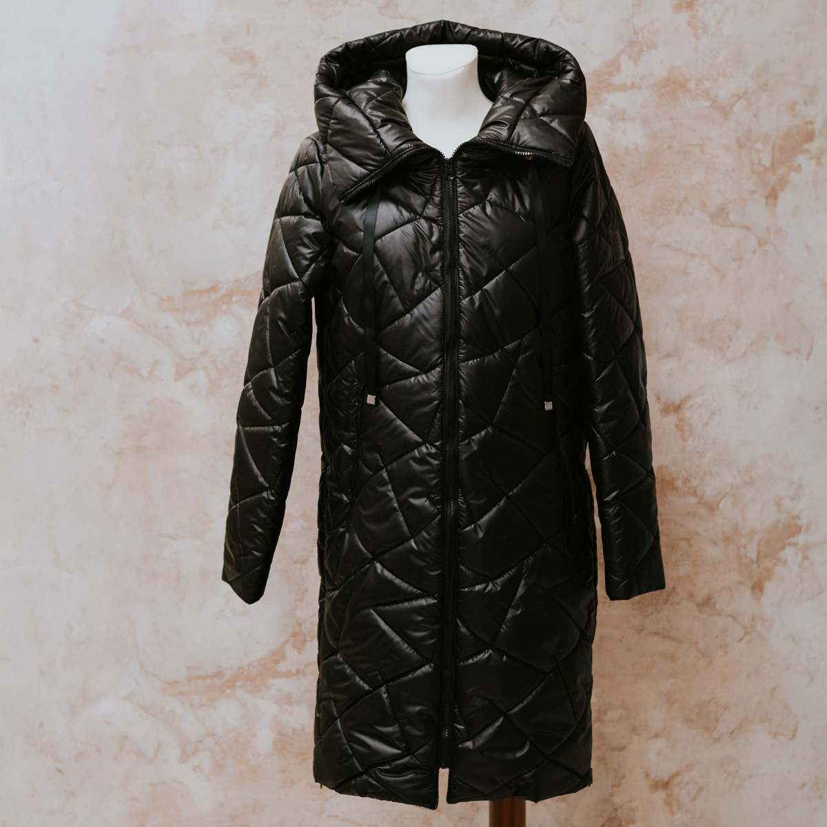 Ez a különleges, fekete árnyalatú, hosszított steppelt kabát a modern nő téli gardróbjának kihagyhatatlan darabja. Puha, párnázott kialakítása nemcsak melegen tart, hanem finoman követi az alakot, így egyszerre praktikus és nőiesen elegáns.