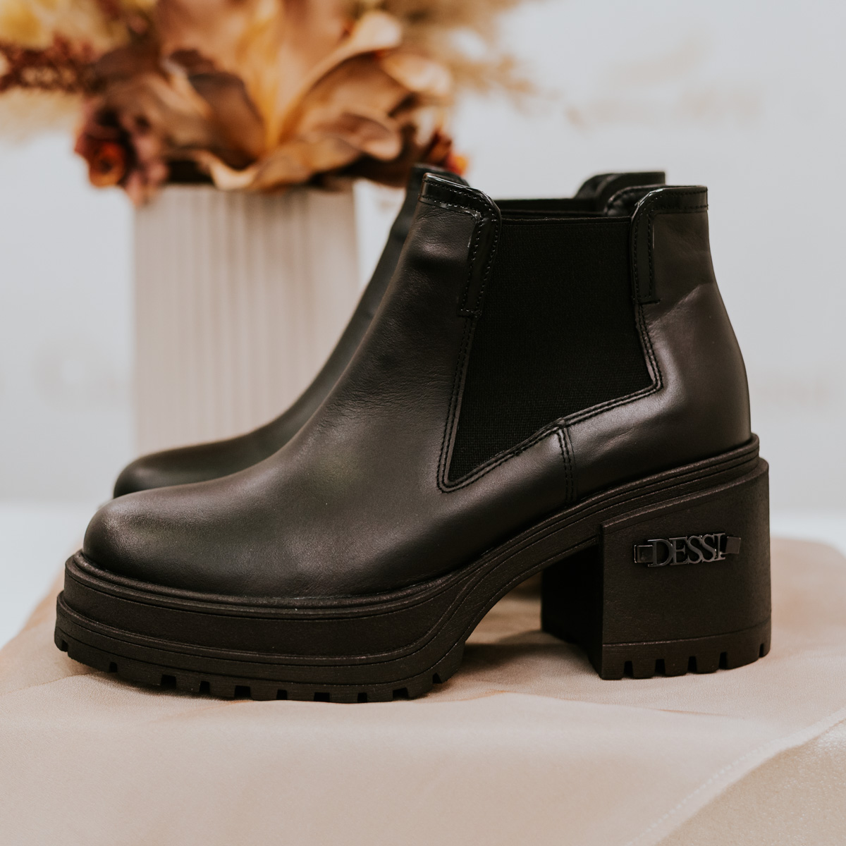 A finoman fénylő, fekete felsőrész időtlen stílust sugároz, miközben a fekete részletek és a vastag, masszív talp erőt és határozottságot adnak megjelenésednek. Az oldalán diszkréten elhelyezett, DESSI díszítés luxusérzetet kölcsönöz — épp annyit, amennyitől a csizma különlegessé válik, mégis tökéletesen hordható marad a mindennapokban.